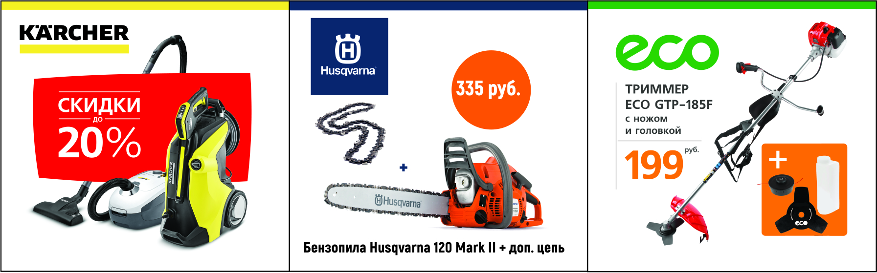 Акции на бензиновые пилы от Husqvarna, триммеры Есo, технику Karcher, Bosch, инструмент Wortex, специальные скидки на более 500 товаров…