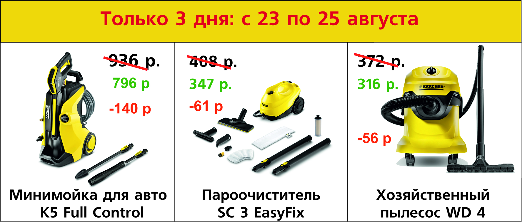 Только с 23 по 25 августа, только в магазине «Удачник» в Молодечно специальная скидка 15% на три модели от Karcher